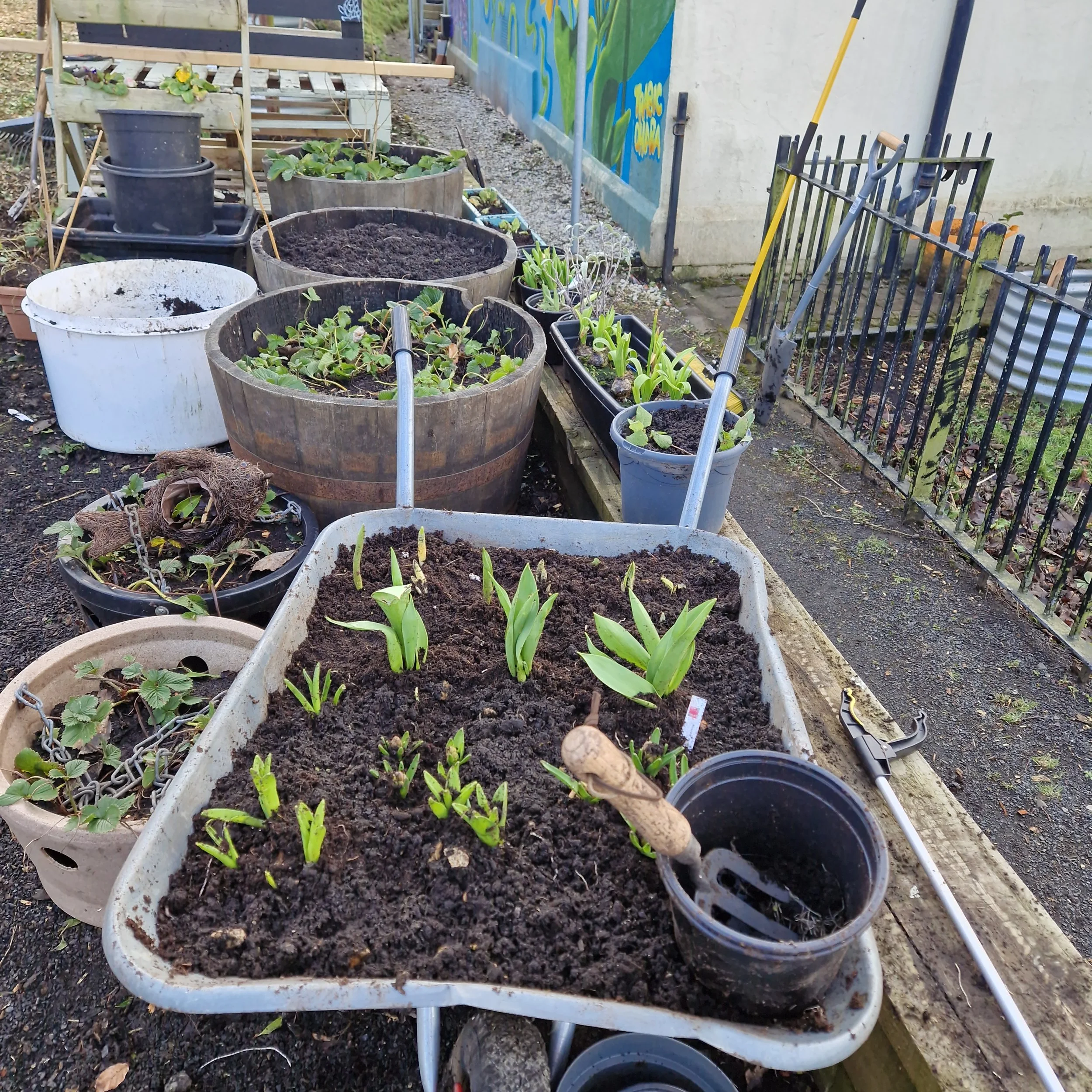 The start of a new year of growing and cooking kicked off with work in our community gardens tidying and planning for seed sowing. We are re-using old compost from Parklea to mulch beds and planters in the nursery schools and community gardens, as well as washing old pots to make up kits to give out to nurseries and the community.
